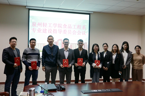 12月6日,我院食品工程系召开食品课程论证会,福建农林大学副校长郑宝东教授、福建省盼盼食品集团执行董事蔡文良、福建省食品工业协会秘书长林玉明、福建省粮油科技研究所刘宜锋教授、福建省食品添加剂及配料工业协会秘书长刘文聪教授、我院食品工程系主任庄培荣以及友臣(福建)食品有限公司、金冠(中国)食品有限公司、福建盼盼食品集团、福建泉州市味源调味品有限公司、福建师范大学闽南科技学院、海欣食品股份有限公司相关负责人出席了会议。