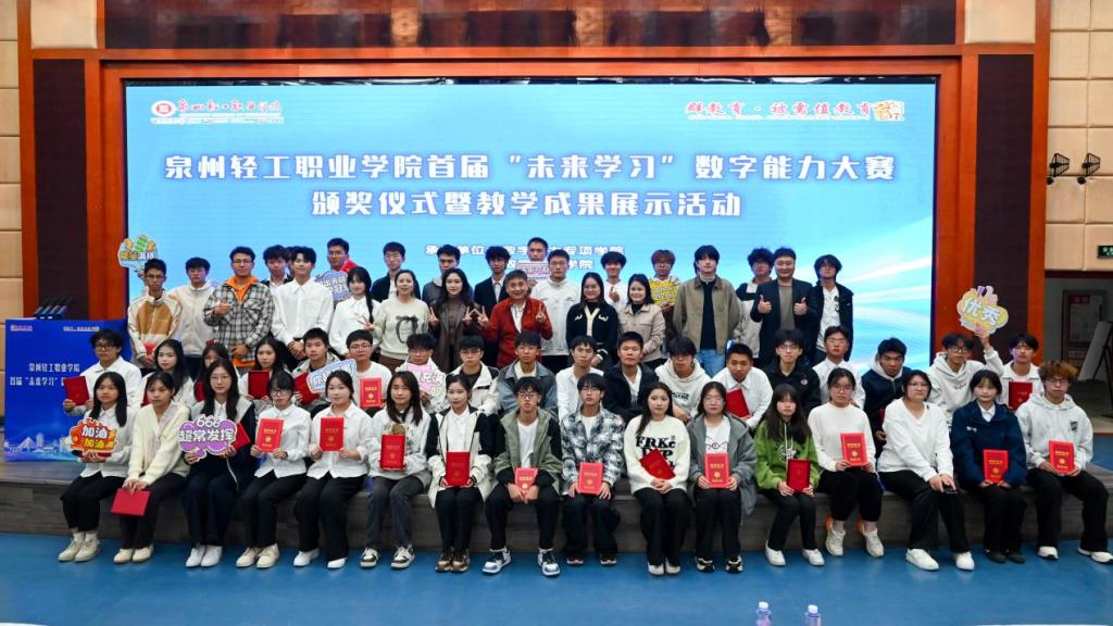 聚光灯下,创意与技术碰撞;赛场之上,青春与梦想齐飞!12月9日晚,泉州轻工职业学院首届“未来学习”数字能力大赛颁奖仪式暨教学成果展示活动在智慧书馆四楼隆重举行。学校校长黄重成、常务副校长喻亮、特级大师何世伟、校长助理王卿潘等领导,各二级学院负责人、教师代表与全校师生代表欢聚一堂,共同见证这场数字技能盛宴的荣耀时刻,感受“特长+”育人模式下的教学成果风采。
